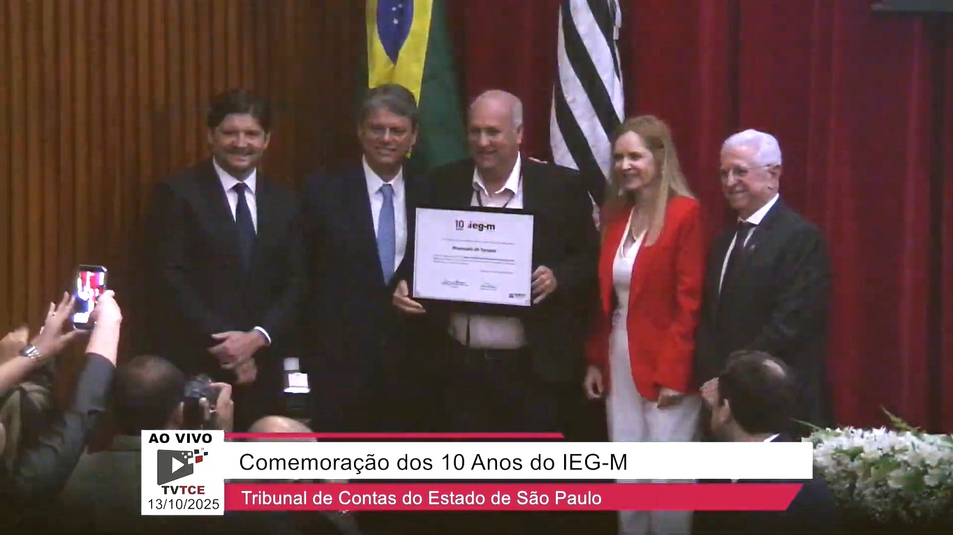 Nesta segunda-feira (13/10/2025), a Prefeitura de Tarumã foi homenageada pelo Tribunal de Contas do Estado de São Paulo (TCE-SP) durante a solenidade que celebrou os 10 anos de implantação do Índice de Efetividade da Gestão Municipal (IEG-M), criado em 2015. O evento contou com a presença de diversas autoridades, entre elas o Conselheiro Sidney Beraldo — presidente à época da criação do índice —, a atual presidente do TCE-SP, Cristiana de Castro Moraes, o presidente da Assembleia Legislativa André do Prado, e o governador do Estado, Tarcísio de Freitas, que realizou a entrega da premiação.